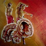 2008Twee flamengo-danseressen in rood en goud. Eind oktober pas te koop wegens deelname aan Palm Art Awards 21 aug tot 17 okt 2009.